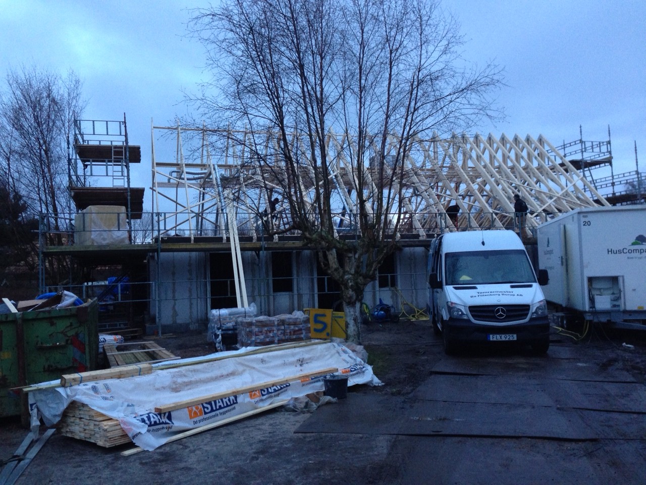 Takstolar är på plats, och snart kommer det lite fönster. Nu börjar man verkligen kunna se hur det ska se ut!