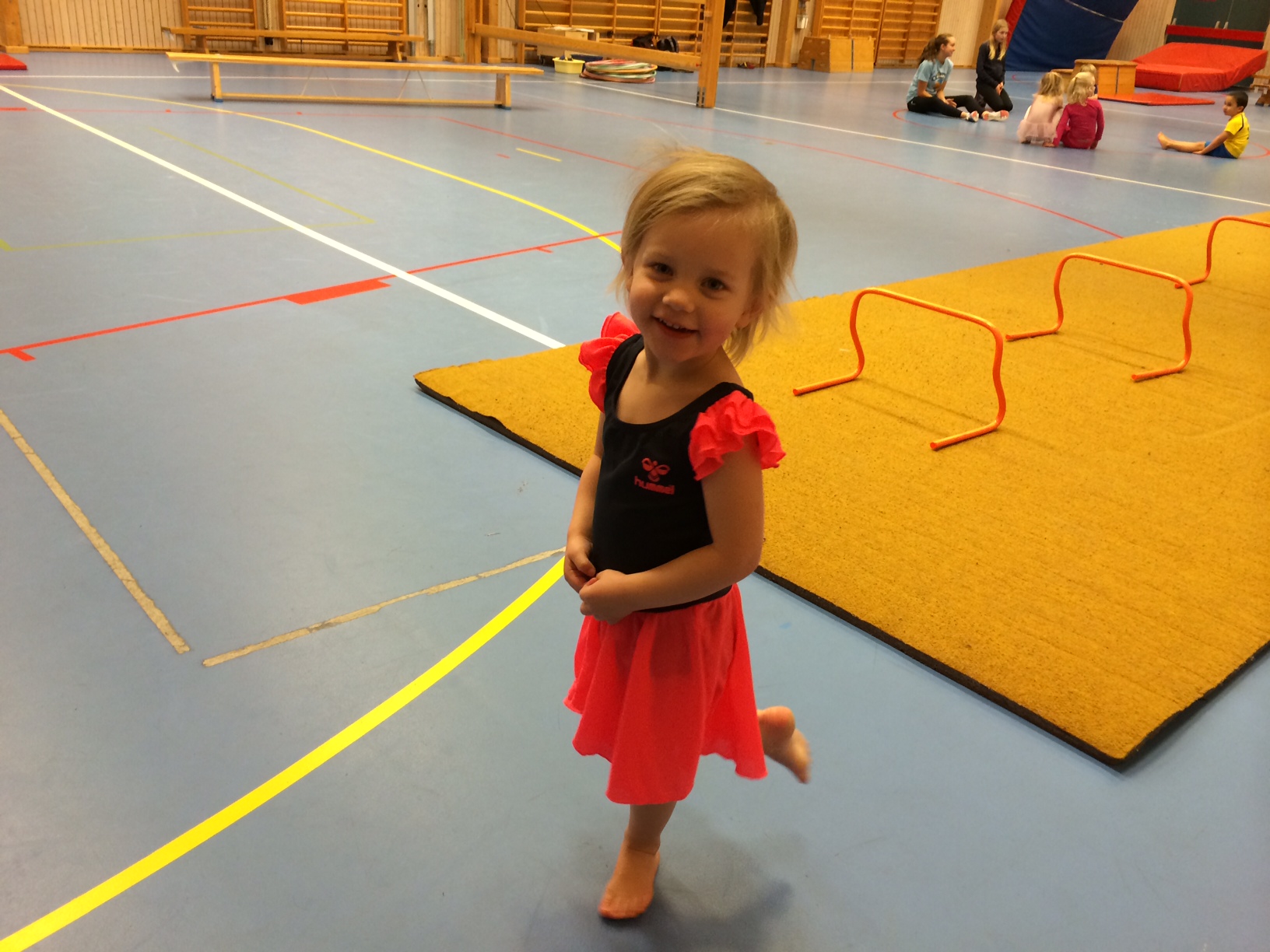 Ellinor fick inga hål i öronen, men vi tog en bild på henne när hon var på sin bamsegympa. Hon har fått dispens då hon är mellan 1-2 år yngre än de andra. Men hon har klarat det galant. Och hon fullkomligt älskar det. Hennes dräkt är en hummeldräkt som hon fick av Jimmy och Anna i julklapp. Jag har aldrig sett en så fin gymnastikdräkt!